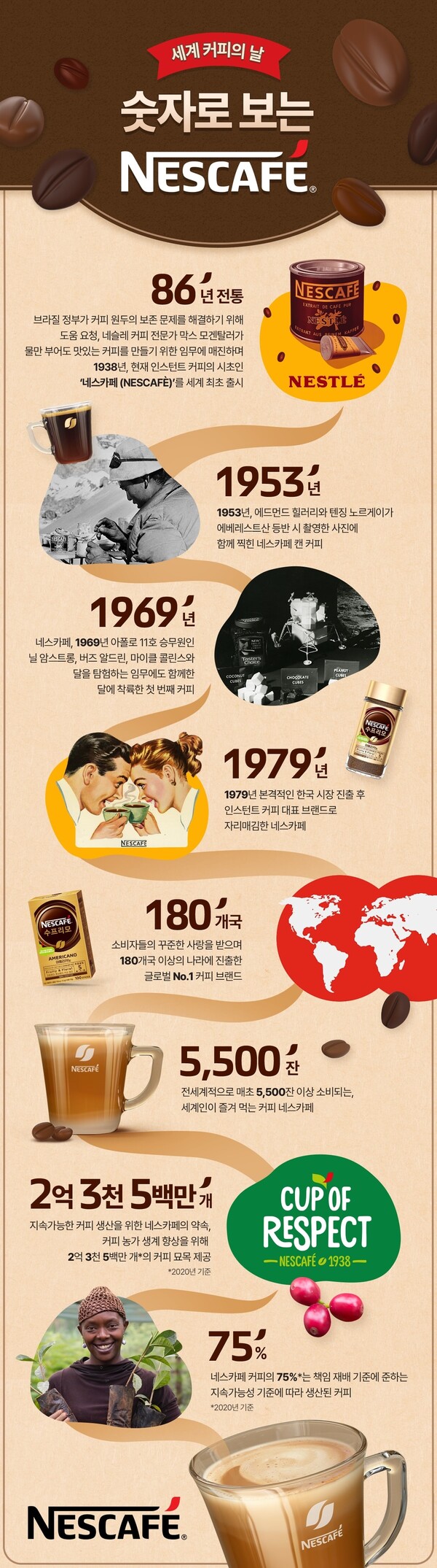 네스카페가 10월 1일 세계 커피의 날을 앞두고 세계 최초의 인스턴트커피 브랜드로서 지금까지 걸어온 역사 및 주요 스토리를 담은 인포그래픽을 공개했다.