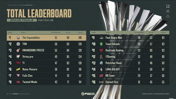 그랜드 파이널의 총 18개 매치 결과, 디 익스펜더블스가 총 141점으로 2024년 전 세계 배틀그라운드 e스포츠 최강팀의 영예를 거머쥐었으며 APAC(아시아∙태평양) 지역팀 최초의 PGC 우승이라는 위업도 달성했다.