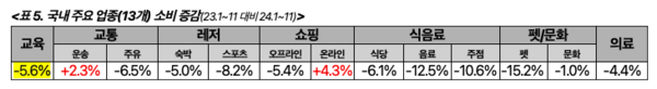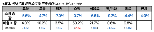 주요 분야에서의 소비는 전년 동월 대비 모두 감소세를 보였지만, 세부 업종(13개)으로 분석 범위를 확대한 결과 일부 업종에서 소비 증가세가 확인됐다.
