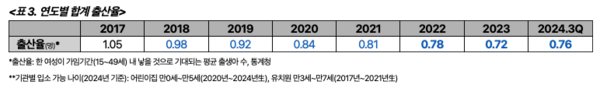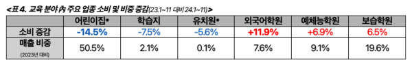 BC카드 관계자는 교육 소비 급감의 주요 원인으로 합계 출산율 1명이 붕괴된 점을 꼽았다. 실제 올 한 해 교육 분야 매출 비중에서 절반 이상(50.5%, 2023년: 56.0%)을 차지하고 있었던 어린이집 소비는 전년 동기 대비 14.5% 감소했다.(표 3. 참고)
