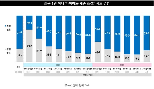 실제로 최근 1년 이내 다이어트를 시도한 적 있다는 응답은 71.8%로 높게 나타났으며, 자신의 체중을 높게 평가한 응답자를 중심으로 다이어트 경험이 많은 특징을 보였다. 다이어트를 시도하게 된 이유로는 건강관리를 위해 필요하고(69.4%, 중복응답), 요즘에 살이 지나치게 찐 것 같다(51.1%)는 점을 주로 꼽아, 다이어트가 건강한 삶을 유지하기 위한 필수 과제로 자리 잡고 있음을 살펴볼 수 있었다.