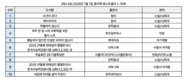 1월 1일마다 도서 구매량 급증… 2025년 첫날 베스트셀러 <소년이 온다> 1위