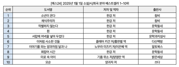 예스24 집계 결과, 2025년 1월 1일 종합 베스트셀러 1위는 한강 작가의 대표작 <소년이 온다>가 차지했다. <소년이 온다>는 지난 10월 한강 작가가 한국 최초 노벨문학상 수상자로 선정되며, 2024년 10월 3주부터 12월 3주까지 10주 연속 종합 1위를 차지한 바 있다. 1월 1일 기준, 50대가 35.7%, 40대가 33.4%, 30대가 14.8% 등의 구매 비율을 보이며 전 연령대에서 고루 사랑받았다.