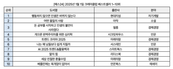 1월 1일 크레마클럽 종합 베스트셀러 1위는 자기계발서 <행동하지 않으면 인생은 바뀌지 않는다>가 차지했다. 이외에도 신년 맞이 경제 공부를 하려는 독자들의 선택으로, 경제경영서가 상위권에 다수 자리했다. 경제 유튜버 ‘할미언니’의 재테크 수업 <돈 공부를 시작하고 인생의 불안이 사라졌다>, 대한민국 대표 트렌드 도서 최신판 <트렌드 코리아 2025>, 2025년 ‘AI 워커 시대’를 준비하는 <AI 2025 트렌드&활용백과>가 각각 3위와 5위, 7위에 올랐고, 경제경영서 <말의 힘>과 <세상 친절한 환율수업>이 10위권 내에 자리했다.