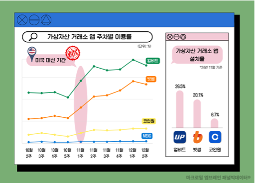 마크로밀 엠브레인 패널빅데이터®의 ‘가상자산 거래소 앱’ 이용 관련 분석에 따르면, ‘친(親) 가상자산’ 전략을 내세우는 도널드 트럼프의 대선 승리를 기점으로 ‘업비트’, ‘빗썸’, ‘코인원’ 등 가상자산 플랫폼이 가파른 성장세를 보인 것으로 나타났다.