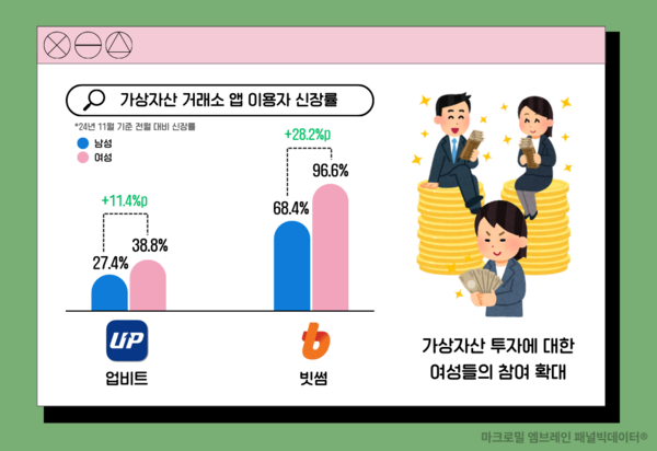 주목할 만한 점은 여성 이용자를 중심으로 업비트와 빗썸의 성장세다. 11월 기준, 전월 대비 이용자 수 신장률을 살펴보면 업비트의 경우 남성 27.4%, 여성 38.8%로, 여성 이용자의 증가율이 남성보다 약 11.4%p 높은 결과를 보였고, 빗썸 또한 여성 이용자 증가율이 남성 대비 28.2%p 높은 수치를 기록했다(남성 68.4%, 여성 96.6%).
