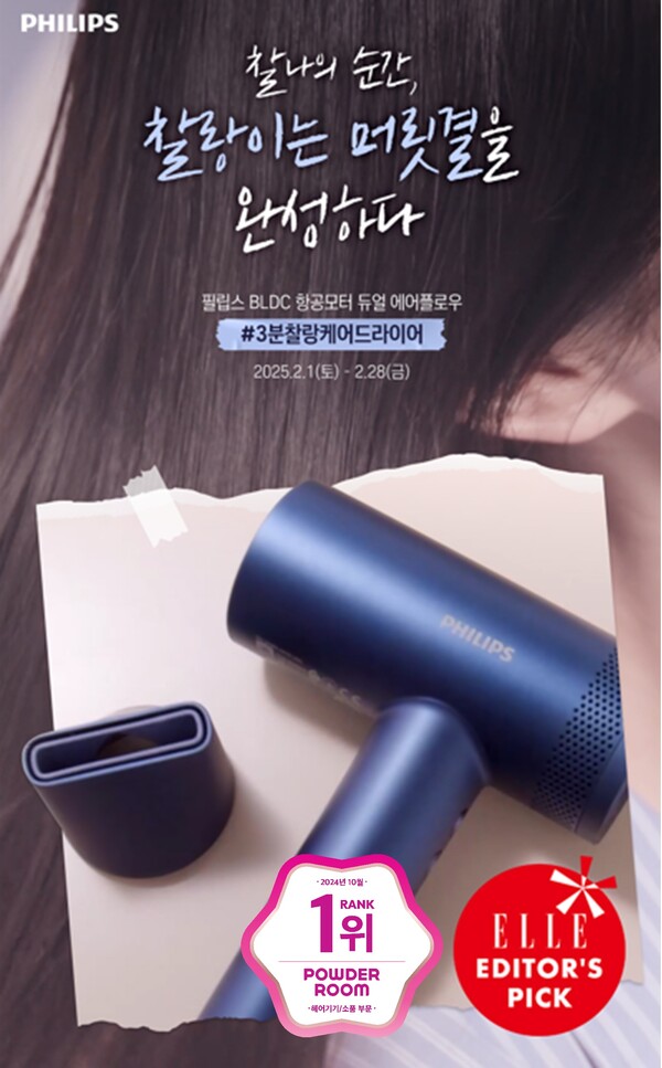 필립스 ‘BLDC 항공모터 듀얼 에어플로우 드라이어’는 세계 최대 패션 매거진 ‘엘르’의 에디터스 픽(Editor’s Pick)에 선정됐으며, 국내 최대 뷰티 커뮤니티 ‘파우더룸’에서 헤어기기∙소품 부문 1위를 차지하며 제품의 우수성을 증명했다. 이로써 필립스는 소비자가 신뢰할 수 있는 브랜드 이미지를 한층 더 강화했다.