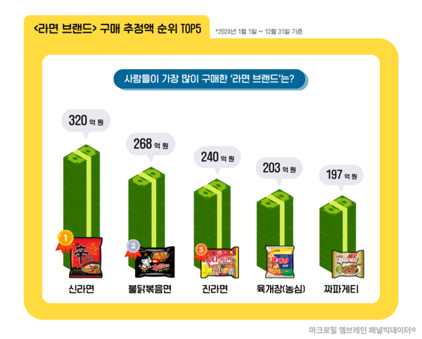 마크로밀 엠브레인 구매빅데이터®[1]의 구매 트렌드 분석에 따르면, 지난해 1월 1일부터 12월 31일까지 편의점에서 판매된 라면 브랜드 구매 추정액은 신라면 계열이 320억 원으로 1위를 차지했으며, 불닭볶음면(268억 원), 진라면(240억 원), 육개장(203억 원), 짜파게티(197억 원) 제품군 순으로 높은 구매액을 기록했다. 주목할 만한 점은 스핀오프 제품을 중심으로 한 주요 상위권 브랜드의 성장세다.