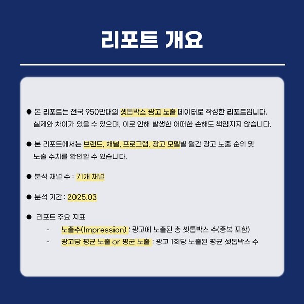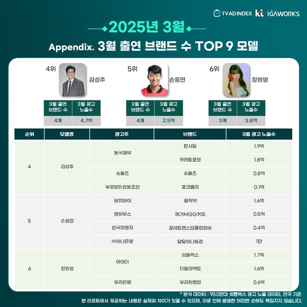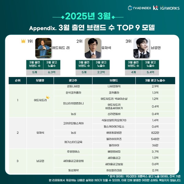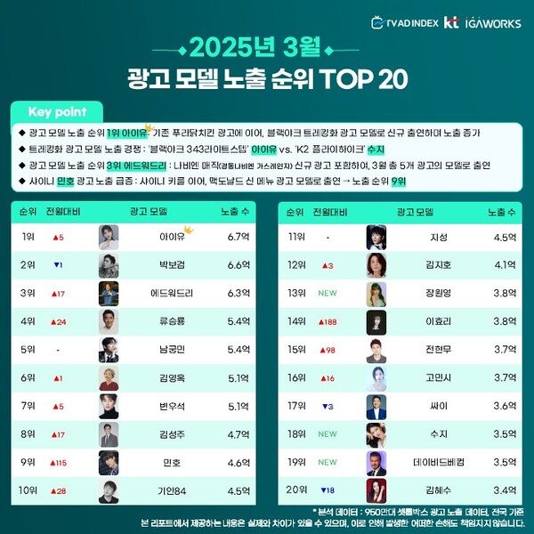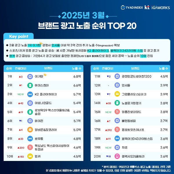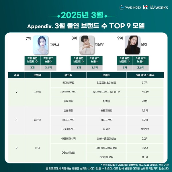 데이터플랫폼 기업 아이지에이웍스가 자사 TV 광고 분석 솔루션을 활용해 작성한 TV 애드 인덱스 <2025년 3월 TV 광고 노출 순위 > 리포트를 공개했다. 이번 보고서는 KT의 950만 셋톱박스 데이터와 아이지에이웍스의 독자적인 AI 기반 데이터 분석 기술인 SCI(Synthetic Customer Intelligence)를 활용해 산출된 분석 결과가 반영되어 있다. SCI는 모바일 사용성 데이터, 카드 결제 데이터, 기타 고객 행동 데이터 등 서로 분산된 데이터를 AI가 정교하게 연결하고 분석해 유의미한 인사이트를 도출하는 방식이다.