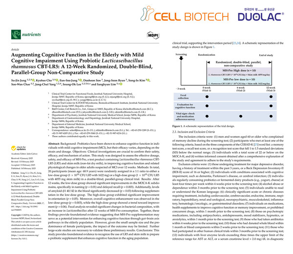 쎌바이오텍 관계자는 “이번 논문은 30년간 축적해 온 자사의 균주 개발 역량이, 고령층 인지 개선이라는 공중보건 이슈에 실질적 해법이 될 수 있음을 입증했다”며, “CBT-LR5는 향후 치매 전 단계 관리에 활용될 수 있는 차세대 인지 건강 기능성 소재로 성장 가능성이 매우 크다”고 강조했다.