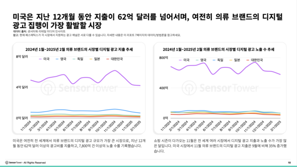미국은 여전히 전 세계에서 의류 브랜드의 디지털 광고 규모가 가장 큰 시장으로, 지난 12개월 동안 62억달러 이상의 광고비를 지출하고, 7800억 건 이상의 노출 수를 기록했다. 쇼핑 시즌이 다가오는 11월은 전 세계 여러 시장에서 디지털 광고 지출과 노출 수가 가장 많은 달이었다. 미국 시장에서 11월 의류 브랜드의 디지털 광고 지출은 9월에 비해 35% 증가했다.