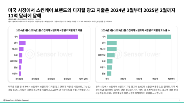 미국은 또한 전 세계에서 스킨케어 브랜드의 디지털 광고 규모가 가장 큰 시장으로, 지난 12개월 동안 11억달러 이상의 광고비를 지출하고, 1200억 건 이상의 노출 수를 기록했다. 한국 시장에서 스킨케어 브랜드 디지털 광고의 1000회 노출당 비용은 3.60달러로, 미국 시장의 9.20달러보다 60%나 낮은 것으로 나타나 뷰티 및 스킨케어 브랜드 광고에 대한 한국 사용자들의 수요나 광고 효율이 다른 시장과 차별화돼 있음을 시사했다.