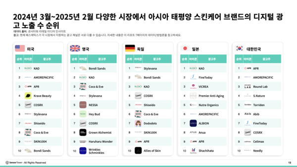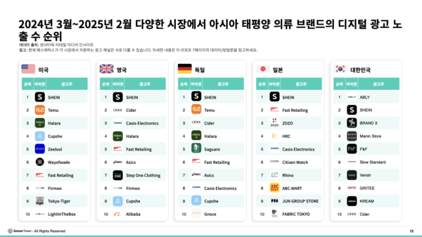 글로벌 마켓 인텔리전스 기업 센서타워(Sensor Tower)가 2025년 한국, 미국, 영국, 독일, 일본 등 주요 시장을 중심으로 의류·스킨케어 브랜드의 광고 지출 및 노출 수 추이를 살펴보며, 각 시장에서 아시아 태평양 브랜드의 광고 노출 순위 등을 담은 ‘2025년 아시아 태평양 의류 및 스킨케어 브랜드의 전 세계 디지털 광고 지출 인사이트’ 리포트를 발표했다.