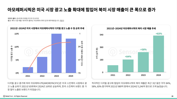 디지털 광고 증가에 따라 ‘아모레퍼시픽’은 미국 스킨케어 시장에서 광고 노출 순위가 2021년 65위에서 2024년 16위로 상승하며, 한국 스킨케어 브랜드 중 가장 많이 노출된 브랜드가 됐다. 적극적인 디지털 광고에 힘입어 ‘아모레퍼시픽’의 북미 매출은 최근 3년 동안 각각 84%, 58%, 83% 증가하며 2021년 989억 원에서 2024년 5246억 원으로 크게 늘었다.