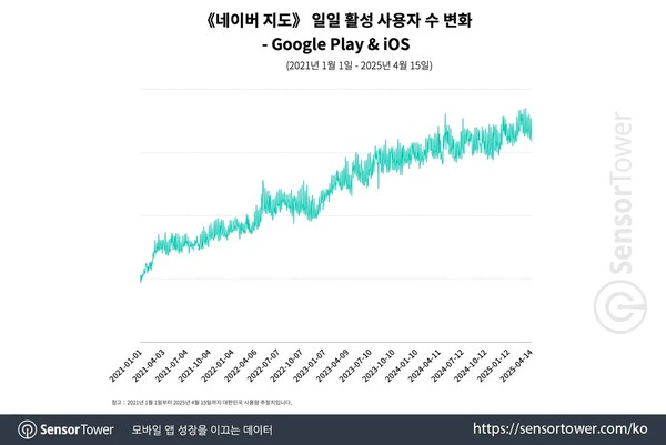 센서타워 데이터에 따르면, 《네이버 지도》의 일일 활성 사용자 수(DAU)는 2021년 이후 꾸준한 증가세를 보여왔으며, 지난 2025년 3월 21일에는 역대 최고치를 기록했습니다. 이는 4년전과 비교해 약 3배에 달하는 수치였습니다.