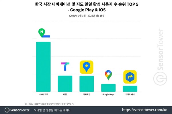 2021년부터 최근까지 한국 시장 지도 및 내비게이션 앱 일일 활성 사용자 순위를 살펴보면, 《네이버 지도》는 2위 앱과 3배 이상 큰 격차를 보이며 1위 자리에 올랐습니다.