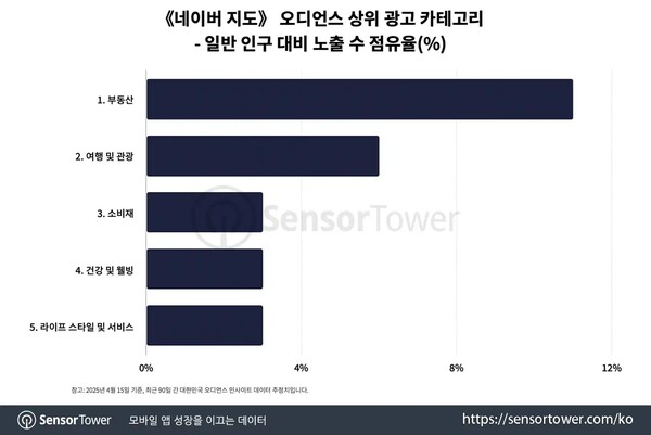 이처럼 폭넓은 오디언스 기반은 광고 타깃 측면에서도 강력한 경쟁력으로 작용합니다. 오디언스 인사이트에서 상위 광고 카테고리를 살펴보면, 《네이버 지도》 사용자들은 부동산, 여행 및 관광, 소비재, 건강 및 웰빙, 라이프스타일 및 서비스 등의 광고 카테고리에서 일반 인구 대비 높은 확률로 노출되고 있는데요. 즉, 단순한 길찾기 기능을 넘어 다양한 라이프스타일 페르소나를 확보함으로써, 경쟁 앱 대비 더 폭넓고 다채로운 광고주를 유치할 수 있는 경쟁력을 입증하고 있습니다.