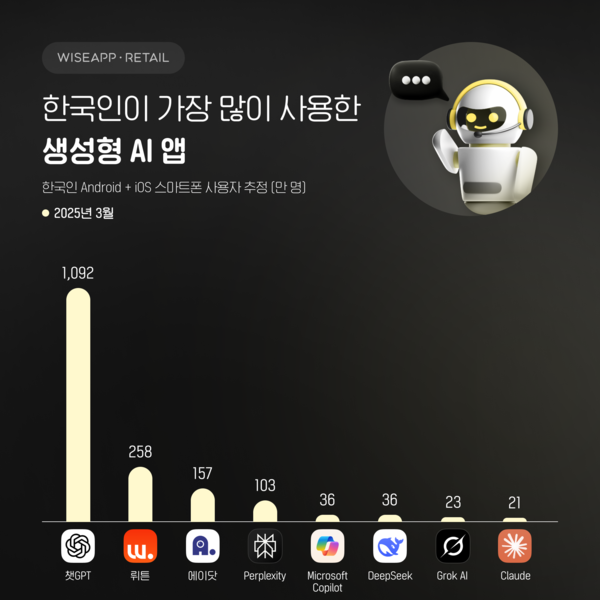 2025년 3월 기준 한국인이 가장 많이 사용한 생성형 AI 앱은 지브리 스타일 사진 변환으로 세계적인 열풍을 일으킨 챗GPT(ChatGPT)로, 월간 사용자 수 1,092만 명을 기록하며 역대 최고치를 경신했다. 그 뒤를 이어 뤼튼 258만 명, 에이닷 157만 명, 퍼플렉시티(Perplexity) 103만 명, 마이크로소프트 코파일럿(Microsoft Copilot) 36만 명, 딥시크(DeepSeek) 36만 명, 그록 AI 23만 명, 클로드(Claude) 21만 명 순이었다.