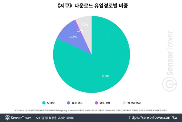 한국 시장에서 《지쿠》의 전체 다운로드 중 81.9%가 오가닉 채널을 통해 발생했으며, 이는 상위 공유 자전거 및 킥보드 앱 중 두 번째로 높은 수치입니다. 가장 높은 비중은 86.2%로 《서울자전거 따릉이》가 기록했는데, 이 앱이 서울시에서 운영하는 공공 서비스라는 점을 고려하면, 민간 기업으로서 《지쿠》의 성과는 더욱 주목할 만합니다.