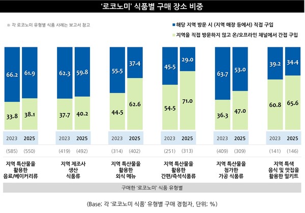 아울러 외식메뉴와 간편·즉석식품 유형은 해당 지역을 방문하지 않고 온·오프라인 채널을 통해 구매하는 비율이 크게 증가한 점도 주목할 만한 결과였다. 주로 대형마트, 오픈마켓 등 접근성이 높은 유통채널을 통해 제품을 구매했다는 응답이 다수를 차지했으며, 이는 로코노미 식품이 지역 기반을 넘어 전국적인 수요층을 확보해 가고 있다는 점에서 그 영향력이 더욱 확대되고 있는 것으로 풀이된다. ‘지역성’이라는 특색은 유지하면서도, 유통 접근성을 바탕으로 경쟁력을 갖춰가고 있는 만큼, 로코노미 식품의 성장 가능성을 엿볼 수 있는 대목이기도 했다.