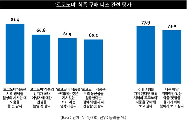 다만, 최근 식품 물가가 오르면서 국내산 식재료를 활용한 로코노미 식품의 가격 상승을 우려(74.0%, 동의율)하는 목소리가 커지고 있는 점은 생각해 볼 만한 대목이었다. 아무래도 로코노미 식품은 상대적으로 가격이 비싸다(61.6%, 동의율)는 인식이 적지 않은 만큼, 물가 상승으로 인한 가격 부담이 시장 성장에 주요한 장벽이 될 가능성이 높아 보였다.