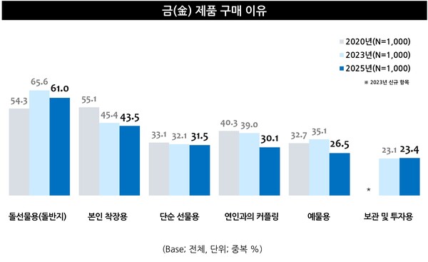 특히, ‘돌 선물’, ‘커플링’, 예물’ 등 전통적인 기념일이나 행사 용도로 금을 구매하는 비율이 이전 조사 대비 한층 낮아진 모습을 보인 점이 주목할 만한 결과였다. 아무래도 최근 금값이 지속적으로 상승하고 있는 만큼, 기념일이나 행사 선물에 큰돈을 쓰기보다는 비용 부담을 줄이려는 태도가 반영된 것으로 풀이된다.