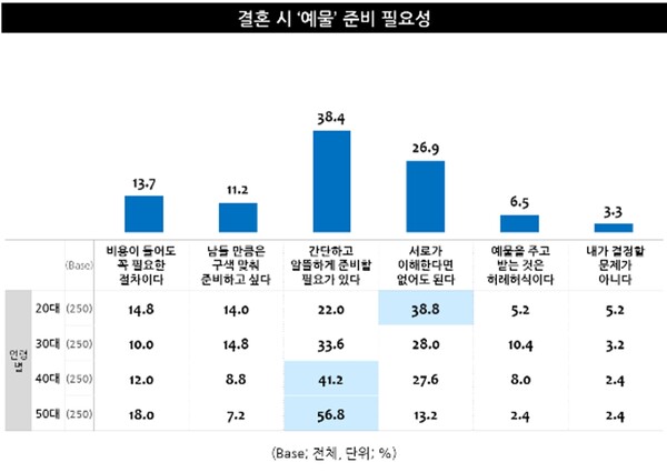 단, 세대별로 결혼 예물에 대한 인식 차이가 뚜렷하게 드러난 점이 특징적이었다. 고연령층일수록 예물은 간소화하더라도 ‘필요하다’는 응답이 두드러진 반면, 저연령층은 서로간의 협의가 되었다면, 예물은 ‘없어도 된다’는 인식이 강한 편이었다. 이는 결혼을 바라보는 가치관과 경제적 여건의 차이에서 비롯된 것으로 보인다. 상대적으로 전통적인 결혼 관습을 중시하는 고연령층과 달리, 경제적 부담과 실리를 우선시하는 젊은 세대가 결혼 예물에 대해 보다 현실적으로 접근하고 있는 것으로 해석해 볼 수 있었다.