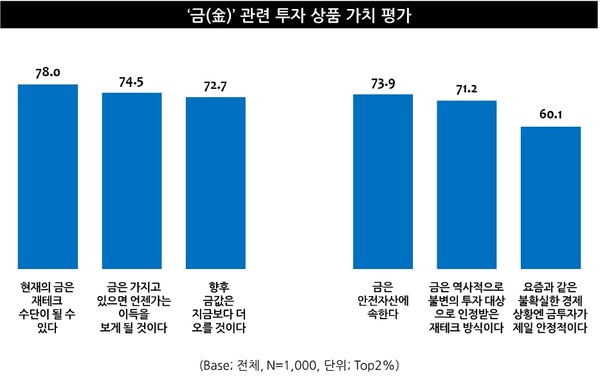 아울러 ‘금은 가지고 있으면 언젠가는 이득을 보게 될 것’이란 응답(74.5%, 동의율)과 ‘금의 재산적 가치는 시간이 지날수록 더 증가할 것’이라는 기대감(63.0%)도 높은 수준을 보여, ‘금’이 단순한 안전자산을 넘어 불안정한 경제 환경 속에서 가치 있는 장기 투자처로 부각되고 있음을 엿볼 수 있었다. 물론, 금값도 언제든 폭락할 수 있다(45.8%, 동의율)는 우려가 적지 않고, 저연령층에게는 진입장벽이 높은 투자처로 여겨지는 경향을 보였지만(20대 38.8%, 30대 35.6%, 40대 30.4%, 50대 33.2%), 전반적으로 금 관련 투자 상품을 바라보는 태도는 긍정적이었다.
