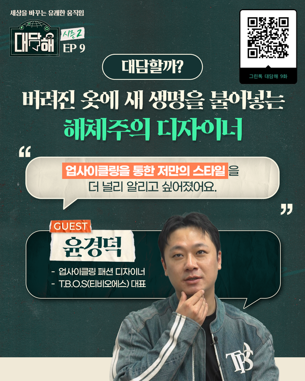 패션 브랜드 T.B.O.S(티비오에스)의 대표인 윤경덕 디자이너는 버려진 의류와 원단을 해체해 의류를 제작하는 업사이클링 패션의 선두주자로 꼽히고 있다. 최근에는 에스파, 아이브, NCT127 등 최정상 아이돌과 협업을 통해 업사이클링 패션을 선보이며 주목받고 있다.