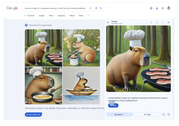 구글은 "'요리사 모자를 쓰고 아침을 요리하는 카피바라 그림 그리기'와 같은 검색어를 검색하면 SGE는 생성된 이미지를 최대 4개까지 결과에 제공한다. 이 이미지 중 하나를 탭하면 '요리사 모자를 쓰고 숲에서 베이컨을 굽고 있는 카피바라가 아침 식사를 요리하는 실사 이미지'와 같은 설명이 포함된 AI가 초기 검색어를 어떻게 확장했는지 확인할 수 있다. 여기에서 설명을 추가로 편집하여 더 많은 세부 사항을 추가하고 비전을 현실화할 수 있다."라고 밝혔다.