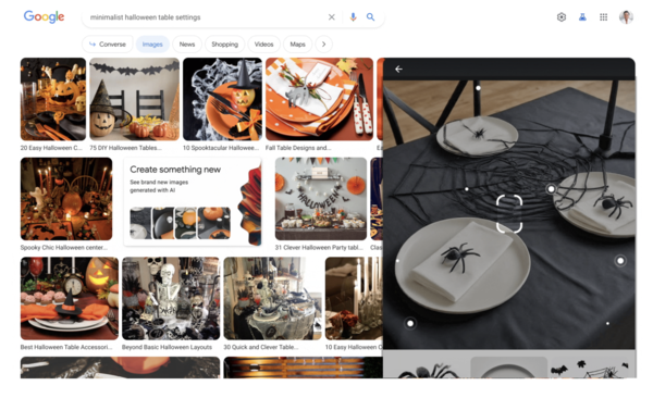 이 기능은 "미니멀한 할로윈 테이블 세팅" 또는 "으스스한 개집 아이디어"와 같은 영감을 검색할 때 표시되도록 설계되었다. 구글 이미지에서 '미니멀한 할로윈 테이블 세팅'을 검색하면 다양한 이미지가 표시된 다음 '새로운 것을 만들어 AI로 생성된 브랜드 뉴스 이미지 보기' 옵션을 누르면 검은색 식탁보, 흰색 접시 및 냅킨, 거미 장식이 있는 테이블 이미지가 생성된다.