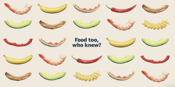 이 브랜드 캠페인은 미소 모양의 식품을 사용하여 아마존의 상징적인 미소를 재미있게 모방하여 이제 아마존도 식품을 판매한다는 메시지를 전달한다.