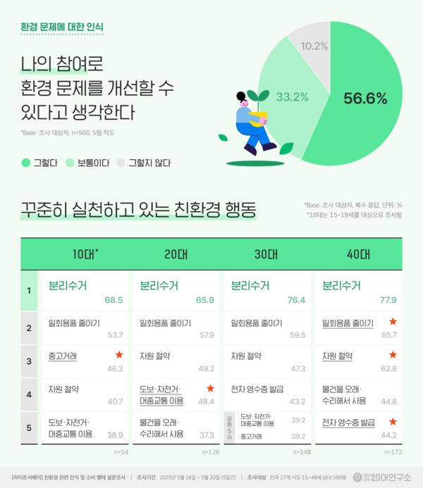 현재 환경을 위해 꾸준히 실천하고 있는 행동은 모든 연령대에서 ‘분리수거’가 1위, ‘일회용품 사용 줄이기’가 2위였다. 그런데 10대(15~19세)는 당근마켓, 번개장터 등 중고 거래를 이용한다는 응답(46.3%)이 친환경 실천 행동 3위로 꼽혀 눈길을 끌었다. 또 20대는 자동차 대신 도보·자전거·대중교통을 이용(48.4%)하고, 40대는 전자 영수증을 발급(44.2%)한다는 응답이 두드러졌다. 30대는 제로웨이스트·리필스테이션 등 온·오프라인 친환경 전문 매장을 이용(15.5%)한다는 응답이 비교적 높았다.