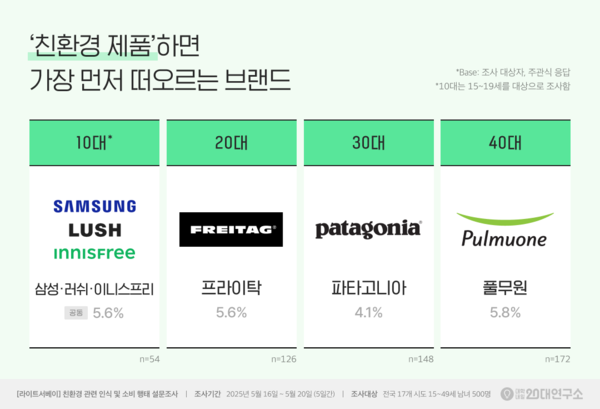 전반적인 친환경 제품 소비 행태와 인식도 살펴봤다. 먼저 ‘친환경 제품’하면 떠오르는 브랜드를 물었을 때 풀무원(4.0%)이 전체 1위로, 응답자들이 언급한 82개의 브랜드 중 가장 많았다. 다만 연령대별 1위는 차이를 보였다. 10대의 경우 삼성과 러쉬, 이니스프리가 공동 1위(각 5.6%)였다. 또한 20대는 프라이탁(5.6%), 30대는 파타고니아(4.1%), 40대는 풀무원(5.8%)이 각각 1위로 나타났다.